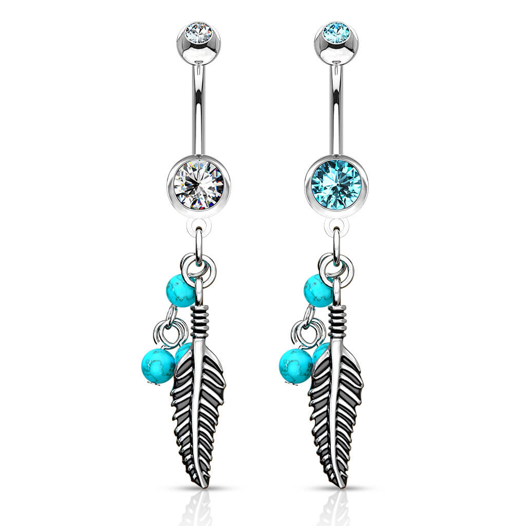 Belly Button Piercing Feather turquoise Semi-Precious Stone dangle Zirconia Silver