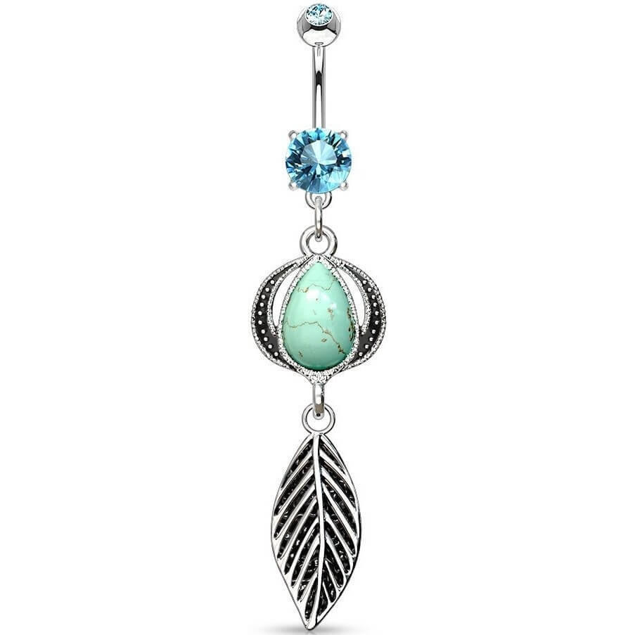 Piercing Nombril Pendentif Plume Pierre Semi-Précieuse Turquoise Zircone Argent