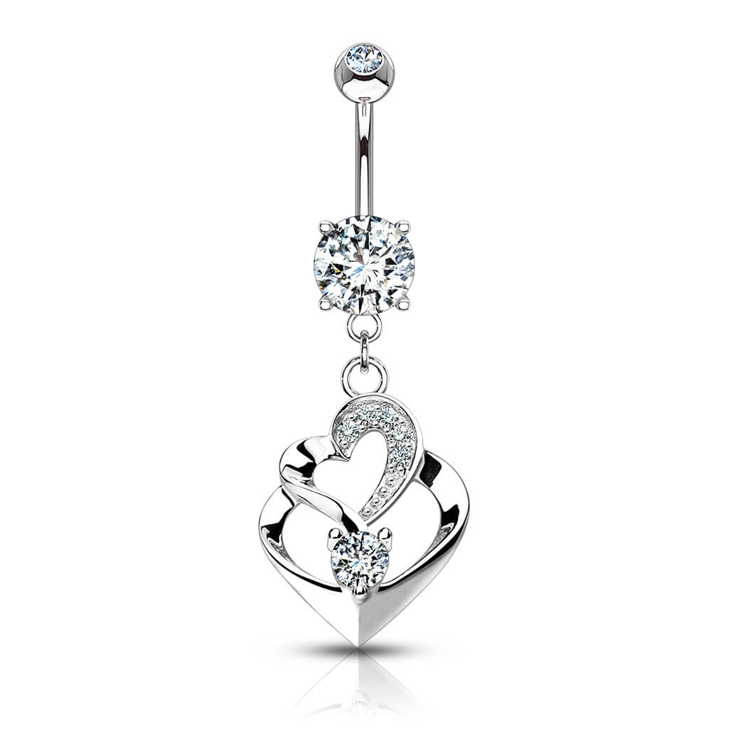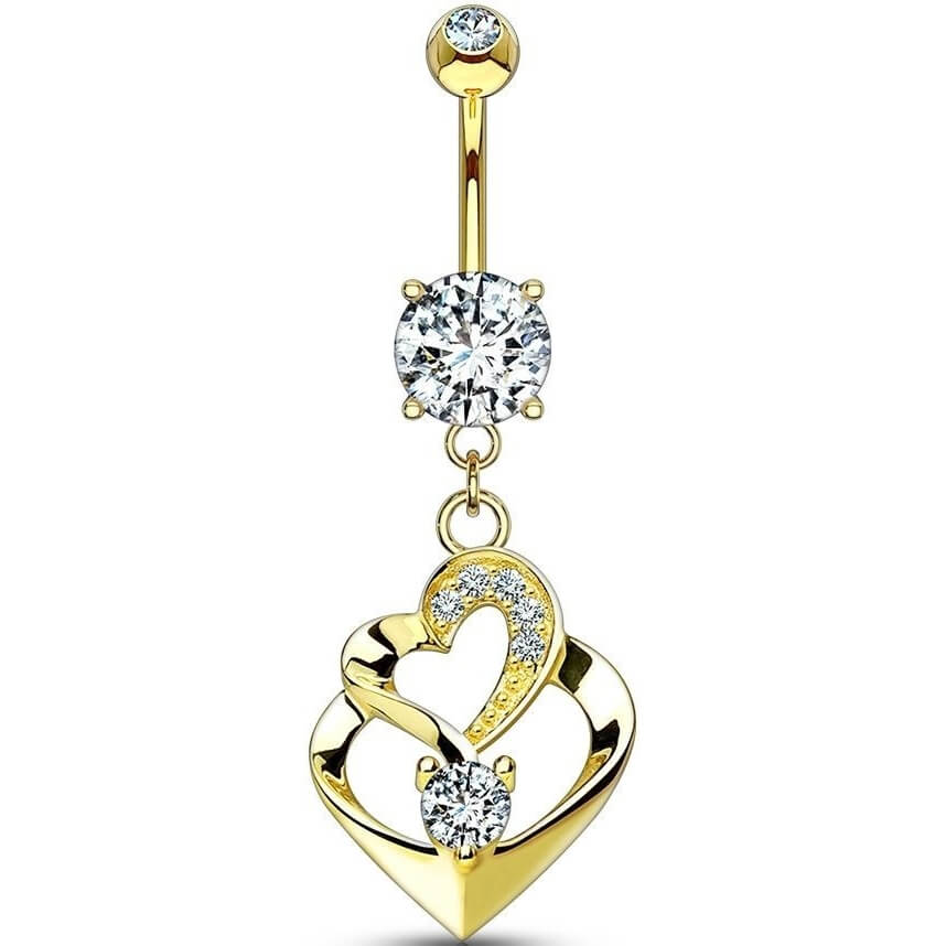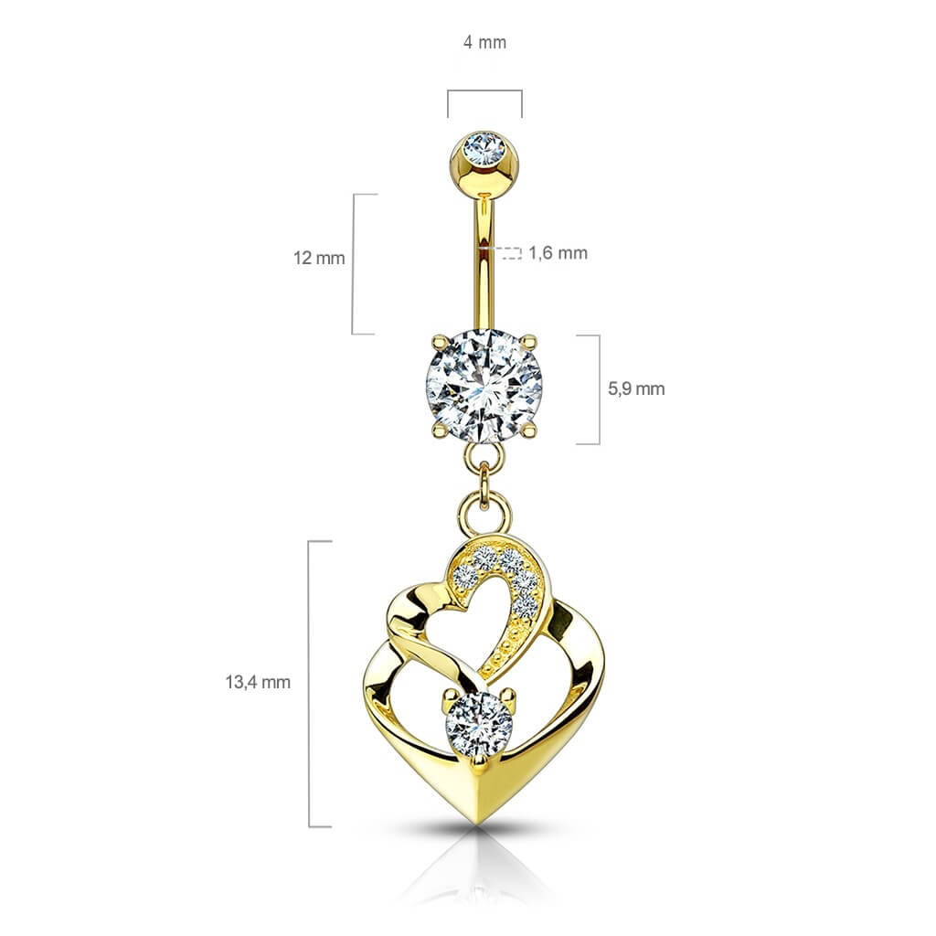 Oro 14 kt Piercing Ombelico Pendente a doppio cuore in zircone